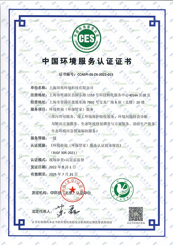 《中國環(huán)境服務(wù)認(rèn)證證書【環(huán)保管家一級(jí)】》